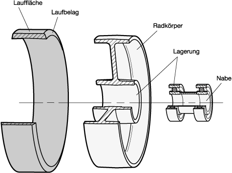 Ein Rad setzt sich aus den Komponenten Lauffläche, Laufbelag, Radkörper, Lagerung und Nabe zusammen, deren Eigenschaften und Funktionen nachfolgend erklärt werden.