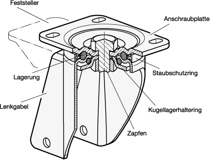 Die Lagerung besteht aus einem doppelten Axial-Kugellager und ermöglicht es der Lenkgabel sich unter der Anschraubplatte zu drehen. Sie ist mit Fett geschmiert und durch den Staubschutzring vor Verunreinigungen geschützt. Zusammengehalten wird die Lagerung durch den Zapfen und den Kugellagerhaltering, der den unteren Abschluss bildet.