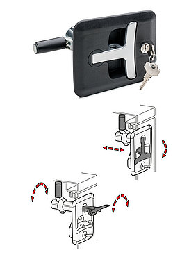 Beim Ein- bzw. Ausklappen des T-Griffs wird ein Hub von 5 mm am Drehriegel ausgelöst, um z. B. den für eine Türdichtung nötigen Anpressdruck zu realisieren. Im ausgeklappten Zustand kann der T-Griff nach links oder rechts zur Seite gedreht werden, sodass sich der Drehriegel um 90° hinter die Klappe bzw. Tür bewegt und diese sich öffnen lässt. Der Drehriegel ist sehr flexibel je nach Anwendungsfall auf Rahmendicken zwischen 13 und 75 mm einstellbar. Der zweistufige Bewegungsablauf sorgt dabei für eine vibrationssichere Zuhaltung.