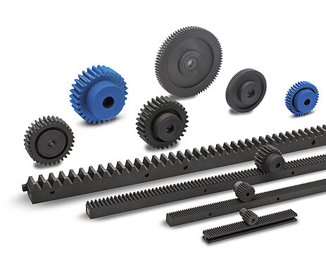 Die Zahnräder und Zahnstangen haben eine Evolventenverzahnung mit einem Eingriffswinkel von 20°. Die Stirnzahnräder GN 7802 werden von Ganter mit Modul 0,5 bis 3 angeboten. Die Polyamid-Zahnstangen GN 7822 sind mit Modul 1 bis 3 bestellbar und verfügen über einen Stahlkern, der unerwünschte Verformungen verhindert.