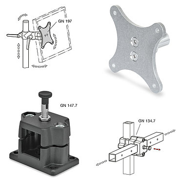 Die neuen Monitorhalterungen GN 197 inklusiv VESA-Adapterplatten sowie die Rastschlitten GN 134.7 und GN 147.7 erhöhen die Einsatzmöglichkeiten und bieten darüber hinaus für verschiedenste Kundenbedürfnisse die passende Lösung.