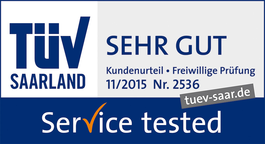 "TÜV Service tested" is based on a voluntary representative customer survey. The seal is awarded only to companies that are valued in accordance with good by its customers.