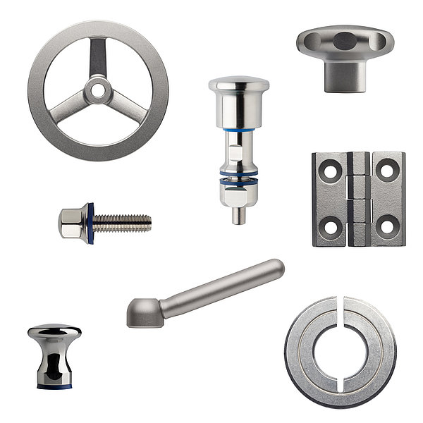 In principle, every part segment of the Ganter portfolio should now also offer a part in A4 quality. This includes handwheels, fixed handles, eye bolts and eye nuts, which are produced in full or partial compliance with DIN. Various hinges, U-handles and ledge handles (which can also be fastened by welding), star and tristar knobs and clamping nuts with single or double levers can also be found in the A4 range.