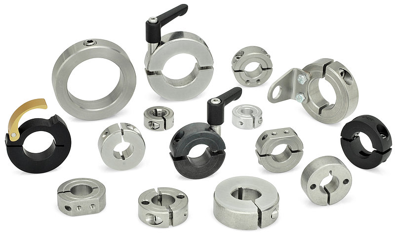 Set collars secure shafts and axles, act as a positive stop or as an attachment option for additional function elements.
