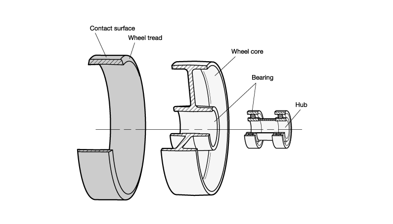 A wheel consists of the components contact surface, wheel tread, wheel core, bearing and hub. The properties and functions of these components are explained below.