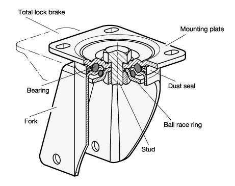 Swivel brackets are made up of the individual components of mounting plate, wheel support fork, bearing, ball race ring, stud (or center hole) and, depending on the design, a dust seal.