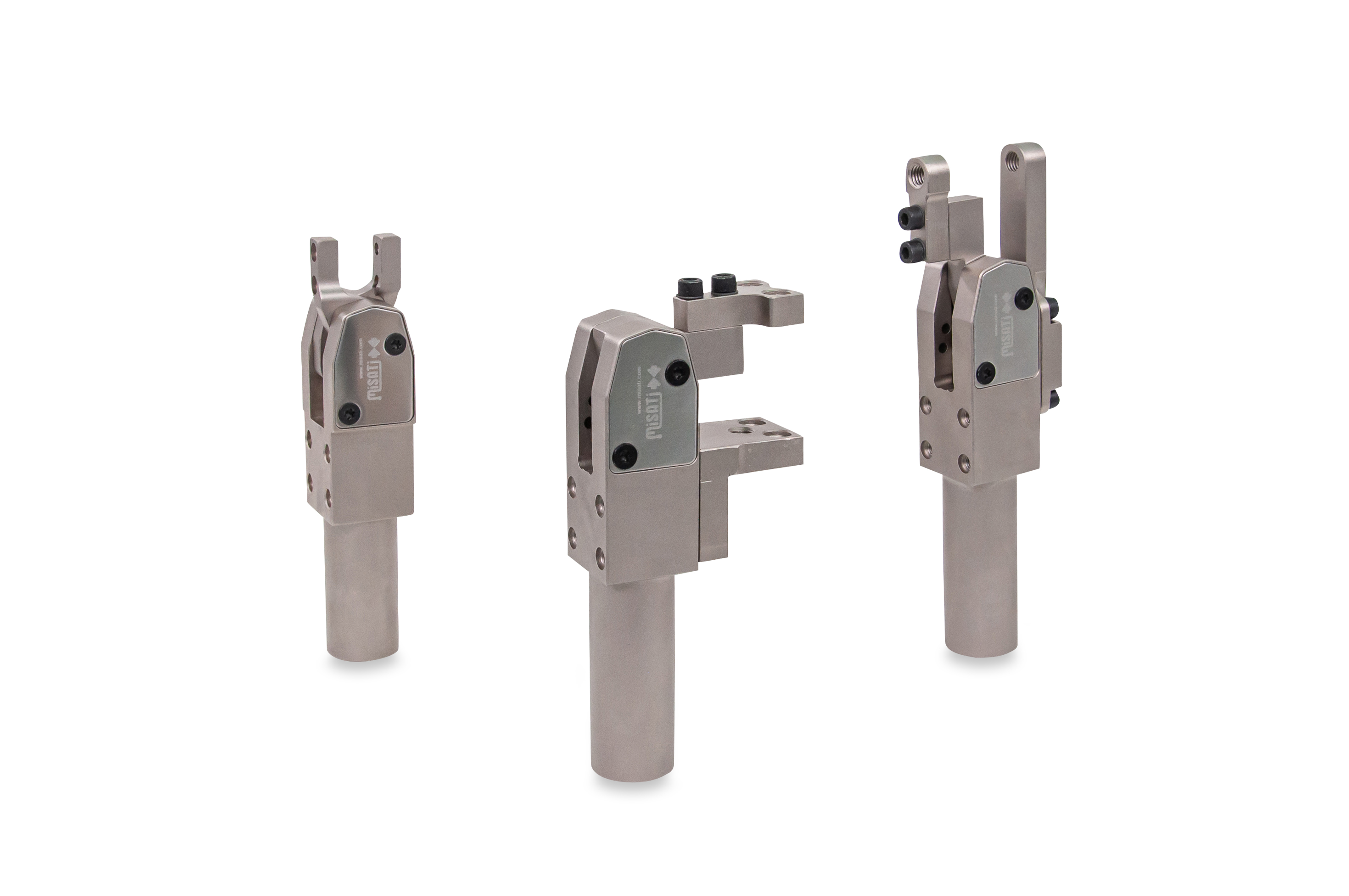 Swing clamps differ from other clamps in terms of their kinematic action. The clamping movements consist of an initial 90° pivot and linear motion downward, followed by the linear clamping motion for clamping of the workpiece.