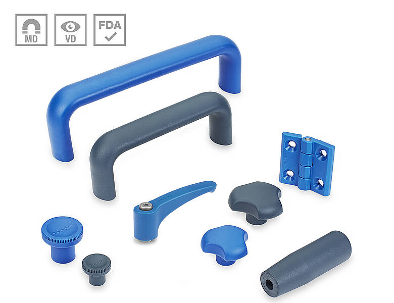 Nuestra gama de piezas estándar detectables incluye pomos, asas en U para armarios, bisagras, brazos de palanca y pomos de tres lóbulos. Lo que todos tienen en común no es solo su color azul, sino también que están hechos de granulados de plástico que cumplen con la FDA (FDA CFR.21 y UE 10/2011). Esto significa que se pueden utilizar tanto en la industria alimentaria como en la farmacéutica sin reservas.