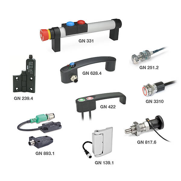 La gama de productos de Ganter incluye otros elementos de control además de estos sensores: Las asas tubulares para máquinas GN 331 y GN 332 proporcionan información de estado a través de una señal luminosa, el pulsador puede llamar a otras funciones y el interruptor de parada de emergencia, que también está integrado, interrumpe la cadena de seguridad del sistema y lo detiene de forma segura para proteger al operario frente a lesiones y a la máquina frente a daños.
