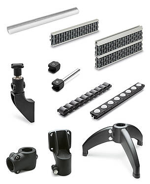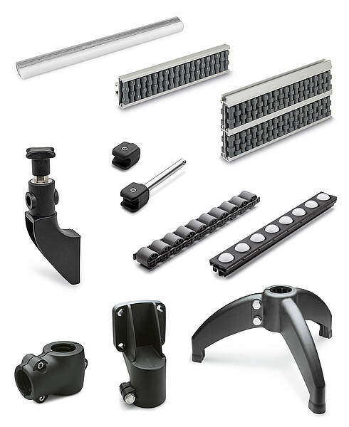 Por ejemplo, dispone de las indispensables guías laterales, que Ganter ofrece como simples elementos de plástico o bien como elementos más complejos con doble fila de cilindros y rodillos de bolas. Estas permiten mover sin daños incluso las piezas más sensibles. Cuando dos carriles guía discurren en paralelo, pueden utilizarse guías intermedias con rodillos en ambos lados. Las guías segmentadas permiten crear curvas, fijando los segmentos individuales en su posición de forma tangencial con perfiles de retención adecuados. Los clips y soportes de retención, patas, piezas terminales, tiras de conexión, tapas, carriles de frenado y guías de inserción garantizan la máxima flexibilidad y unas soluciones profesionales incluso en las situaciones más particulares. Es posible efectuar ajustes y modificaciones de forma rápida y fácil, a veces incluso sin herramientas.