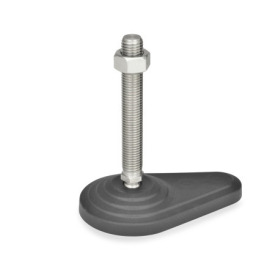 Los pies de nivelación, también llamados pies de máquinas, se usan para soportar y estabilizar máquinas y sistemas. Generalmente constan de una placa de pie y un espárrago roscado, y están disponibles en diseño rígido o como pies articulados para suelos que no sean perfectamente nivelados.
