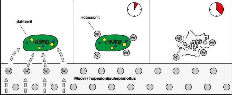 Hopeaionit (Ag⁺) diffundoituvat muovin pinnalta ja kiinnittyvät mikrobin soluseinämiin. Lyhyen ajan kuluttua hopeaionit tunkeutuvat mikrobin soluseinämän läpi ja tuhoavat solunsisäisen entsyymiaktiviteetin. Mikrobin geneettinen materiaali joutuu hyökkäyksen kohteeksi, mikä estää solun jakautumisen jatkumisen ja lopulta tuhoaa taudinaiheuttajan.