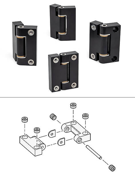 GN 7580 -tuoteperheeseen kuuluu kolme eri kokoversiota, kussakin neljä sisä- ja ulkolehtityyppiä. Saranalehdet puolestaan erottuvat toisistaan asennustyypin perusteella, joka voi olla tangentiaalinen tai radiaalinen, ja jossa käytetään upotettuja lieriöreikiä tai ruostumattomasta teräksestä valmistettuja integroituja kierreholkkeja. Lisäksi Ganter halusi varmistaa yksinkertaisen ja kohdistustarkan asentamisen: Säätöreiät varmistavat saranoiden tarkan kohdistamisen asentamisen aikana.