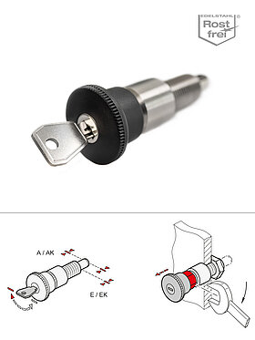Indeksitapin luvattoman irrottamisen tai säätämisen estämiseksi avaamiseen ja sulkemiseen tarvittavaan kuusikantaruuviin pääsee käsiksi vain, kun lukko on avattu ja pää vedetty pois. Lisävarusteena on saatava myös vastamutteri, joka tilataan mallimerkinnällä AK tai EK, jossa “K” tulee saksan kielen sanasta “Kontermutter”.