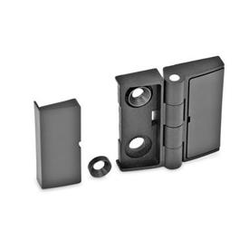 Les charnières réglables maintiennent et fixent les portes et caches aux équipements et aux boîtiers avec un mouvement rotatif.